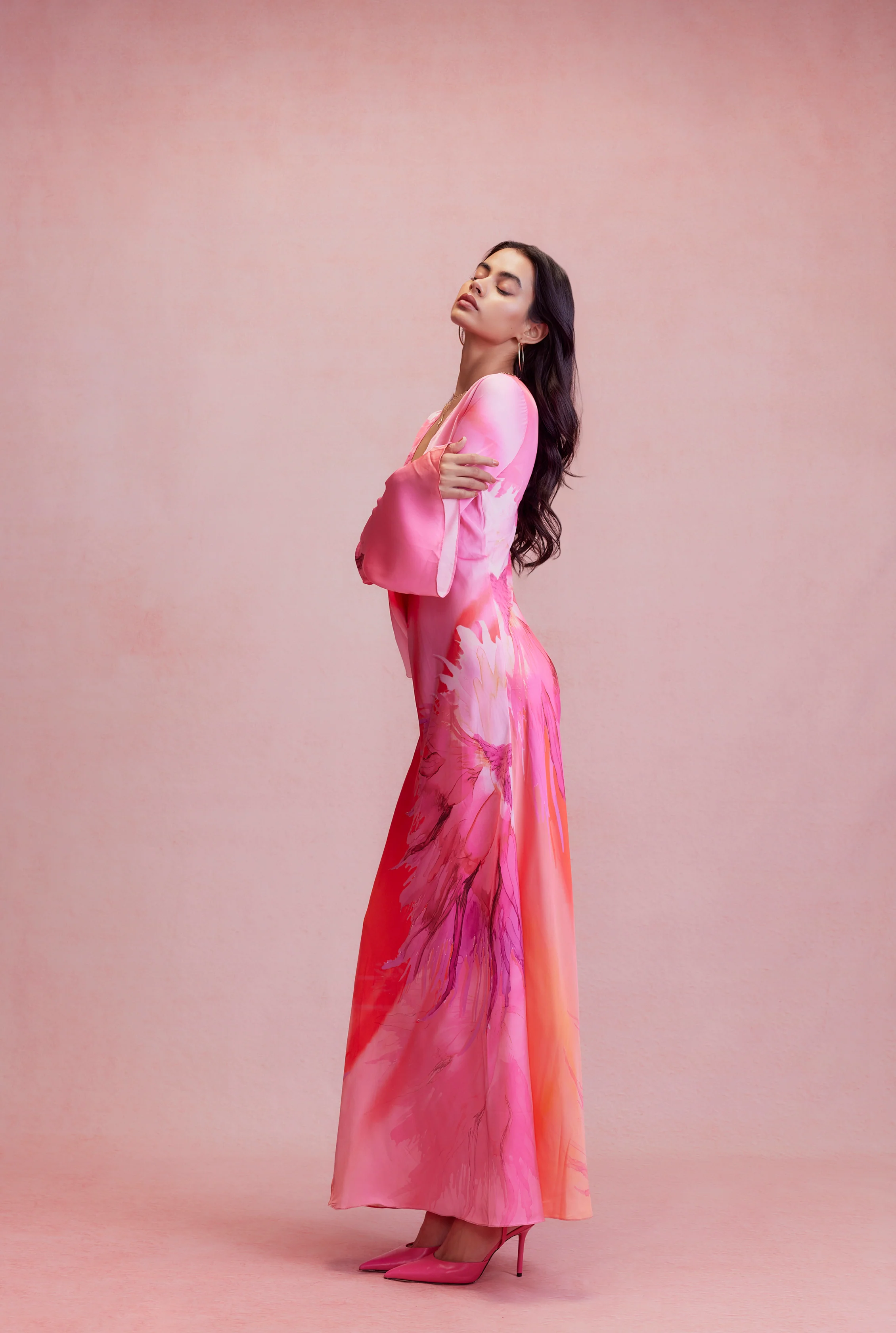 A statement holiday style, the Abira Long Dress is from the Resort'24 collection. Made from luxurious polyester satin Lycra, the dress exudes a gorgeous sheen resplendent in pink and orange ombre hues, and an abstract print, capturing the essence of a tropical sunset. Featuring a darling V-neck and chic long-flared sleeves, it's fitted at the bust for a harmonious balance of style and movement. The straight hemline flows down to the ankle making for an enchanting look. A perfect style that transitions from champagne brunches to After Hour parties.