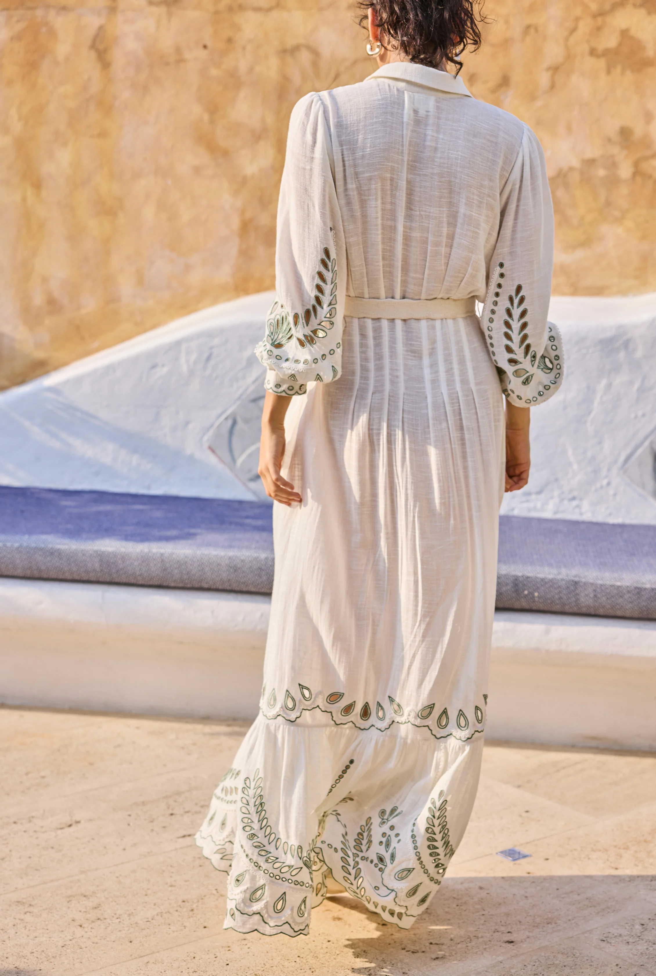 The ethereal Off White Alya Long Dress is from the Summer '24 Collection. This relaxed-fit long shirt dress, crafted from soft cotton cross-slub fabric, exudes effortless elegance and comfort. Featuring a collared neck, front button placket, and long sleeves, the dress is adorned with delicate embroidery lending a touch of artisanal sophistication. The scalloped hemline adds a feminine flair, while the buckled belt cinches the waist, enhancing the silhouette and adding a stylish detail. A slip is included with the Alya Long dress.