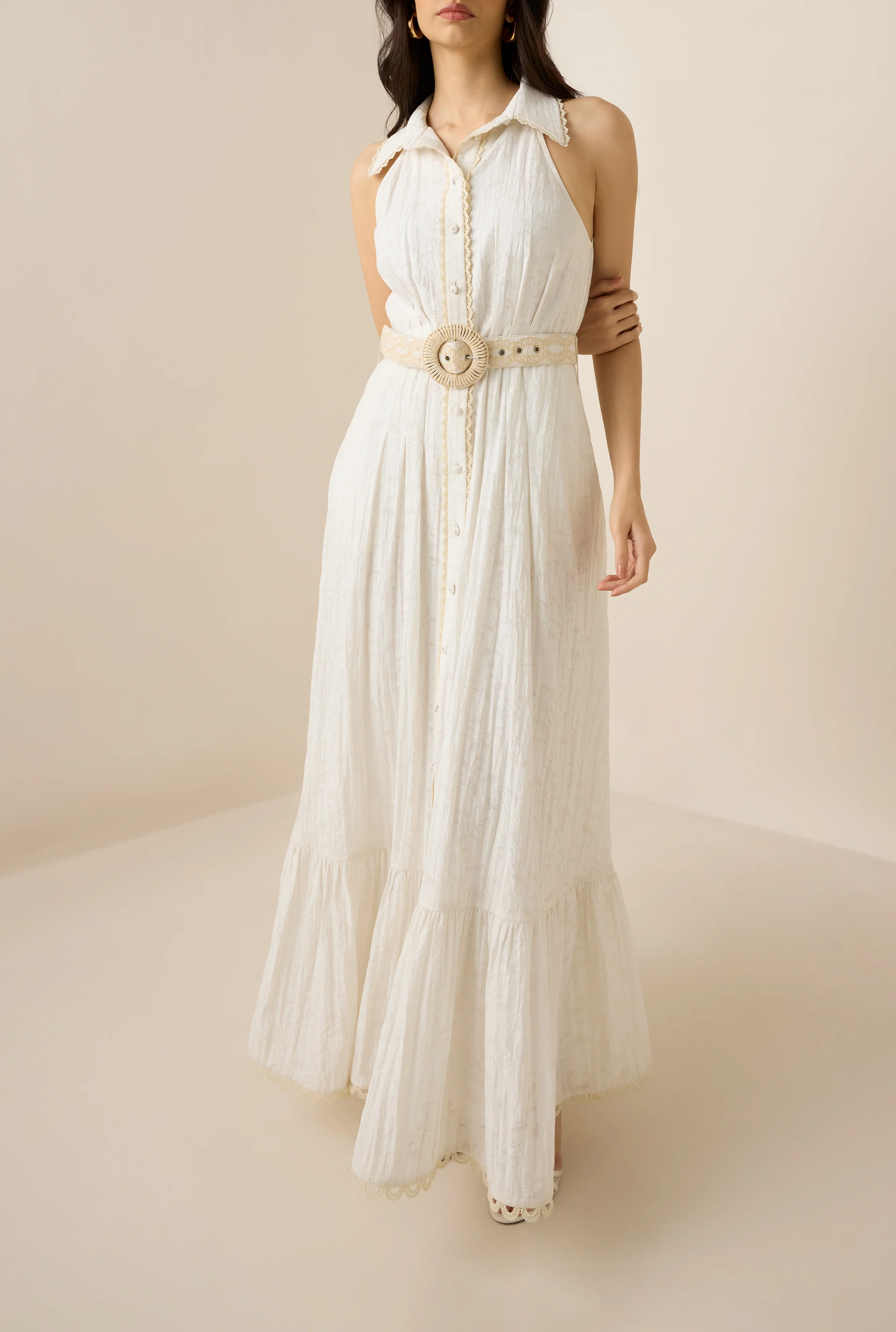The Anvi Shirt Dress from the Resort 25 collection is a timeless white long dress that merges elegance with ease. Featuring a halter neck and sleeveless design, this dress showcases delicate lace detailing along the front placket and handcrafted buttons. An embroidered buckled belt adds structure to the relaxed fit. The dress is fully lined and comes with a front button closure. An ideal and timeless choice for laid back daytime outings or relaxed evening affairs.