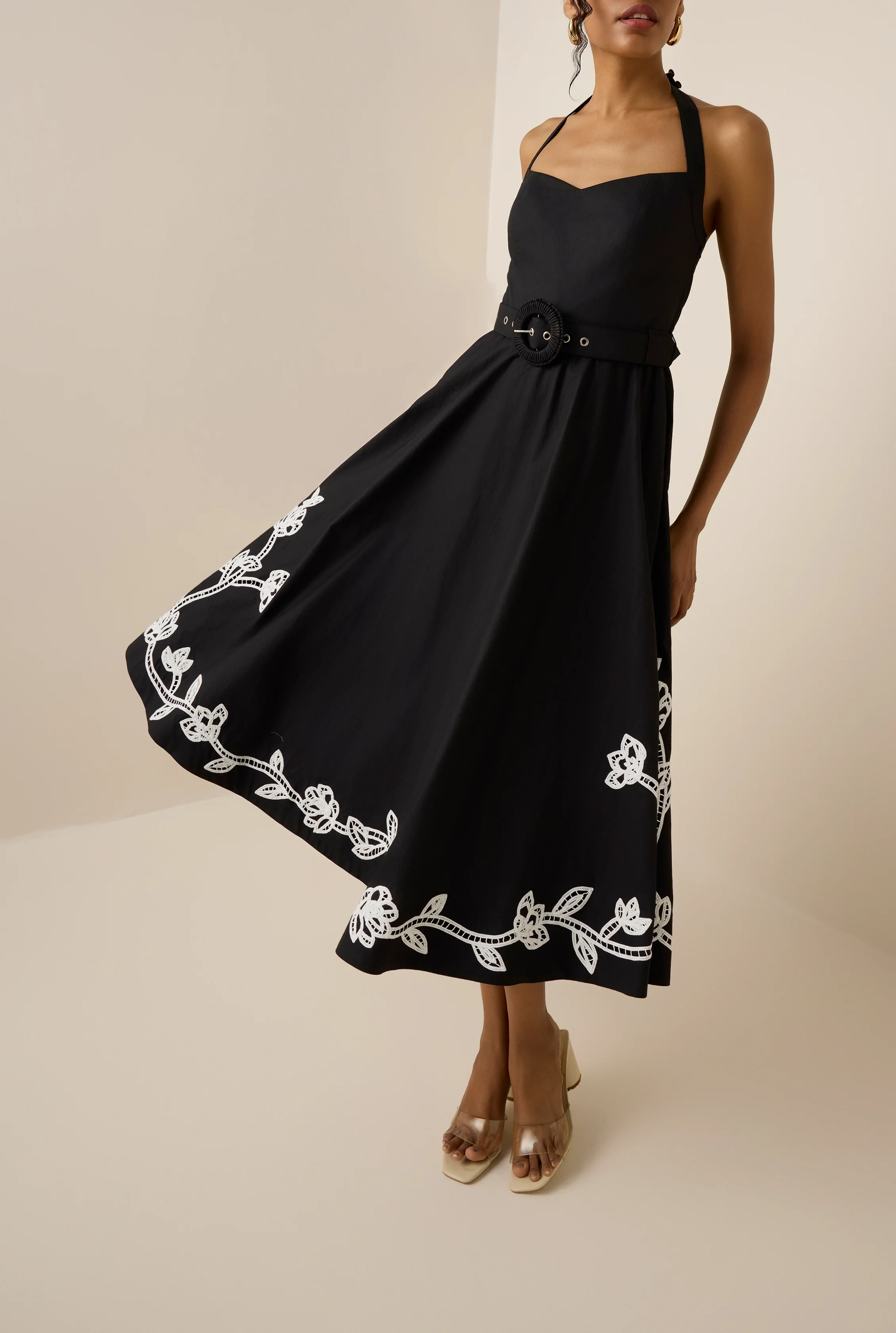 The Daha Midi Dress from the Resort '25 Collection is crafted in crisp cotton poplin- a perfect blend of classic charm and contemporary style. Featuring a fitted bust, sweetheart neckline, and delicate halter straps, this black and white midi dress is adorned with floral Battenberg embroidery. The buckled belt adds a touch of structure, while the side zipper closure and full lining ensure a flawless fit.