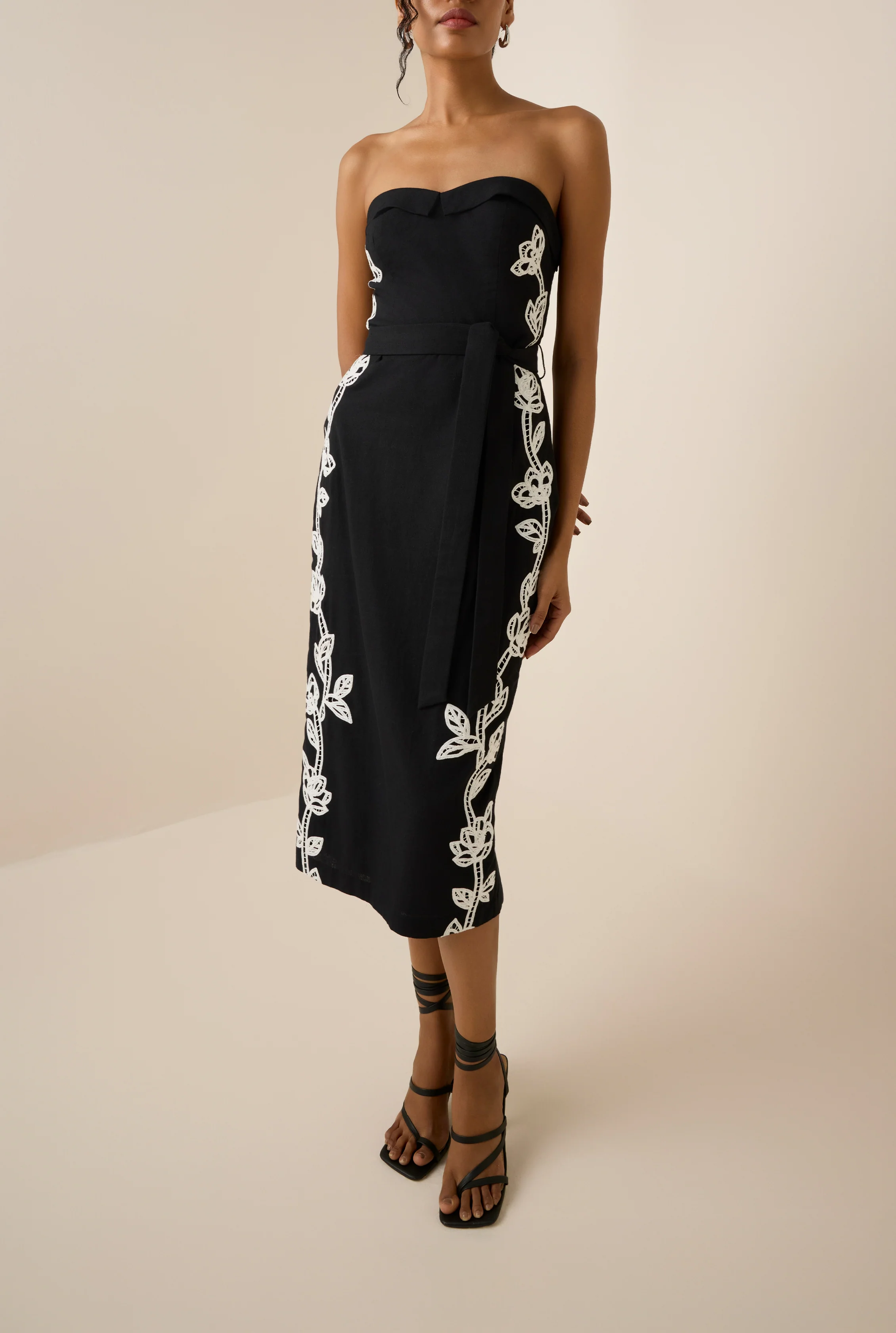 A captivating blend of elegance and romance, the Daha Midi Tube Dress from the Resort '25 Collection is designed to enchant. Crafted in cotton linen with a fitted silhouette, this black dress is adorned with white floral Battenberg embroidery. The sweetheart neckline and tie-up belt add to its alluring design, while the midi length and side zipper closure ensure both elegance and comfort. Perfect for that statement-making look!