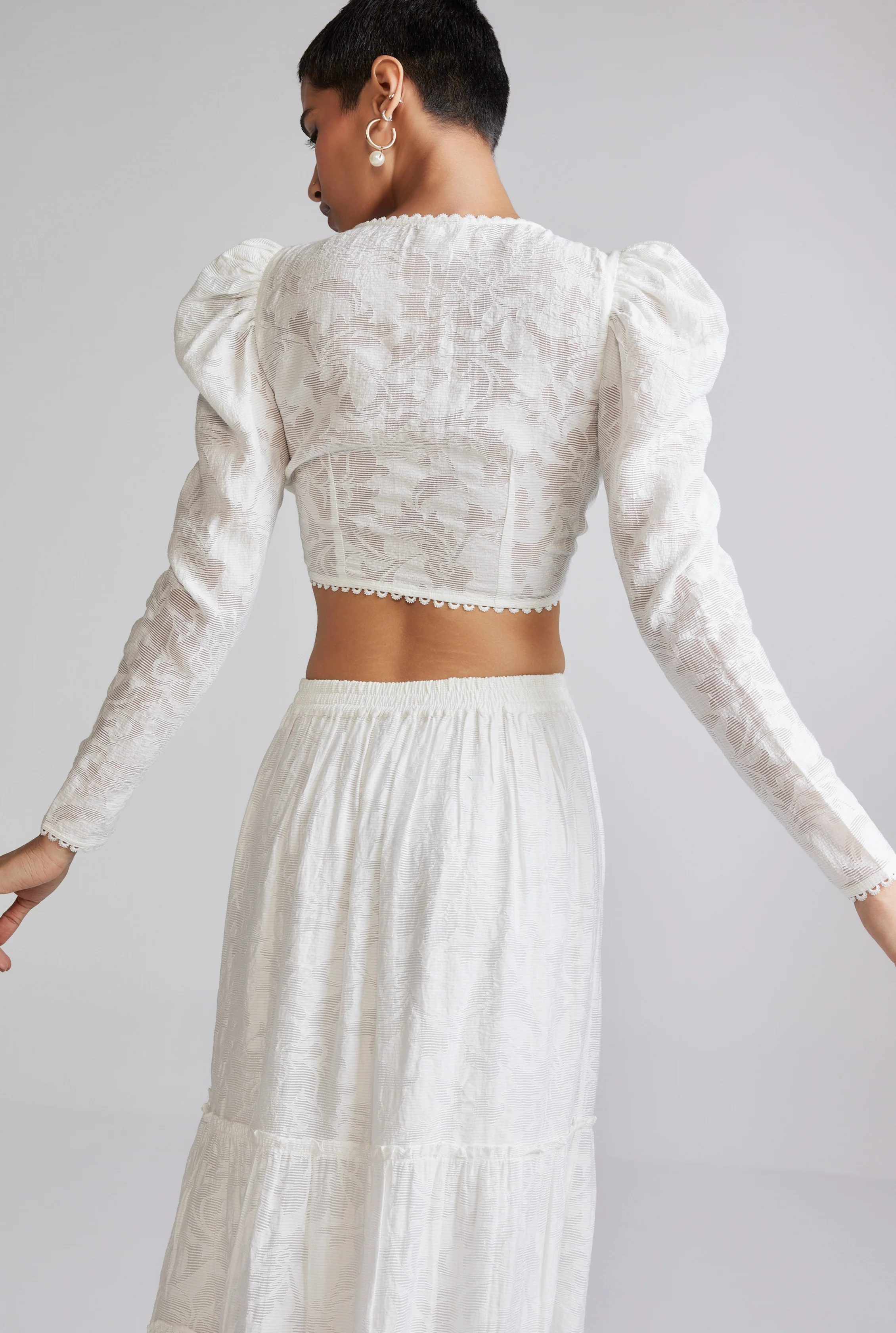 The Ilara White Midi Skirt from the Resort'24 Collection is a mainstay on a holiday mood board! Handcrafted from viscose nylon jacquard, the skirt features a chic side slit and it beautifully flows from the waist to the ankles culminating in a lace-detailed scalloped hemline. The skirt fastens with a concealed zipper closure. Team it up with the Ilara Knot Top for a perfect look.
