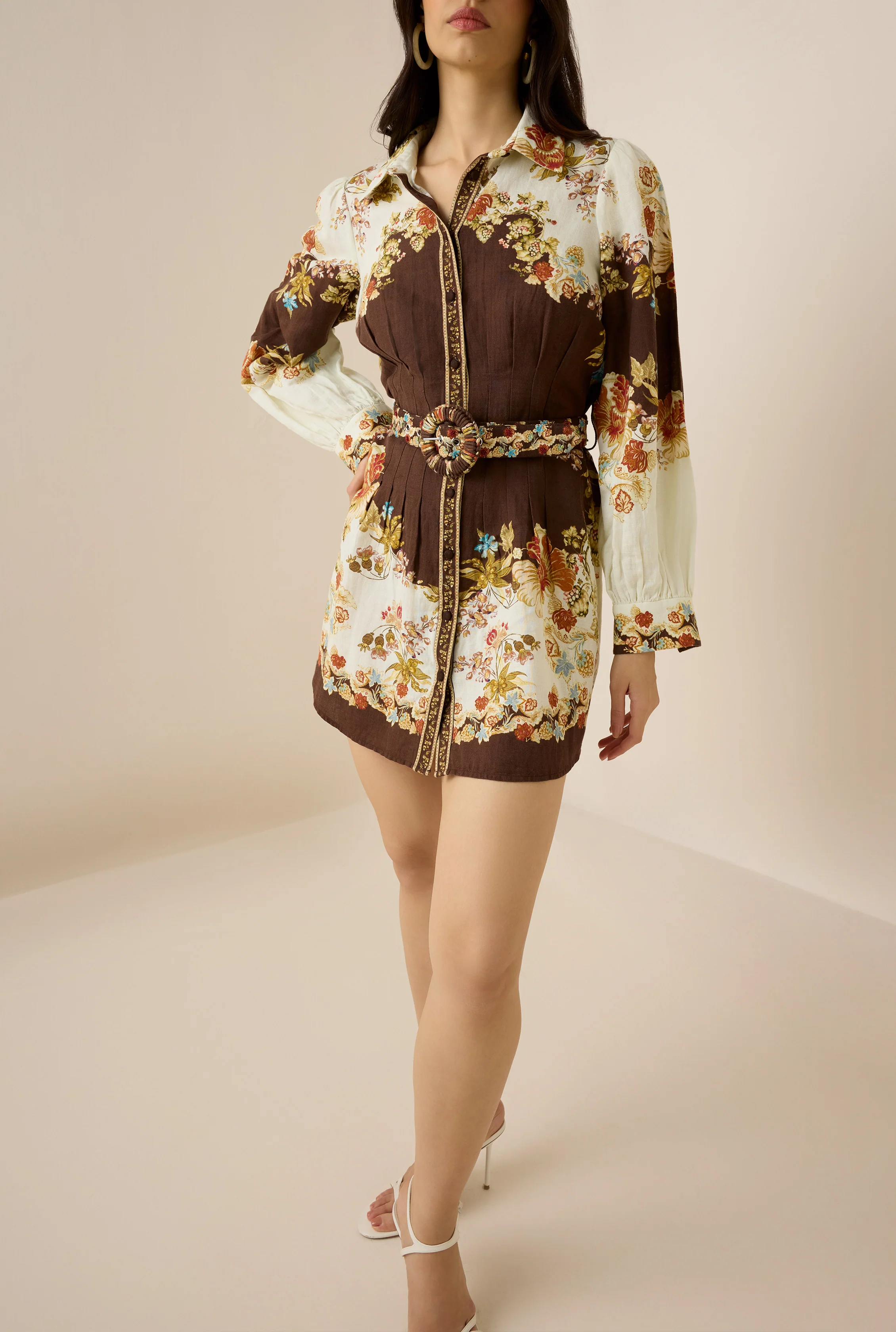 The Rohi Short Dress from the Resort 25 collection brings a chic blend of comfort and style. Crafted from a cotton-linen blend, this relaxed-fit dress showcases an all-over floral chintz pattern, with center front buttons and a classic shirt collar. Blouson sleeves with cuffs add a touch of retro drama, while the handcrafted beaded buckle belt provides a polished finish. Perfect for both casual beach days and moonlit evening strolls.