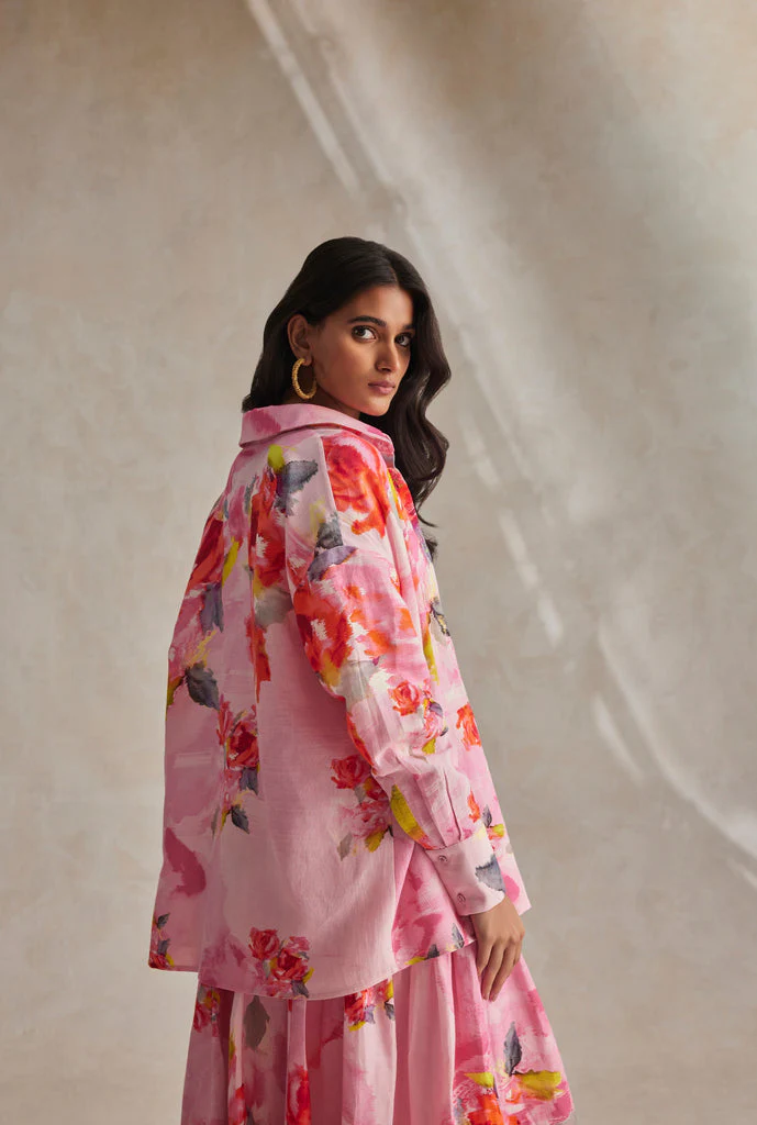 The Rosa Pink Oversized Shirt is an uplifting style from the Spring'24 Collection. Dipped in a blushing pink hue and overall floral print, it is crafted in lightweight and airy cotton linen. An oversized silhouette, the shirt features full cuffed sleeves, a smart shirt collar, and a front placket button closure which is beautifully accentuated with embroidered buttonholes. Take it for that poolside soiree paired with the Rosa Pants for a lovely Springtime look.