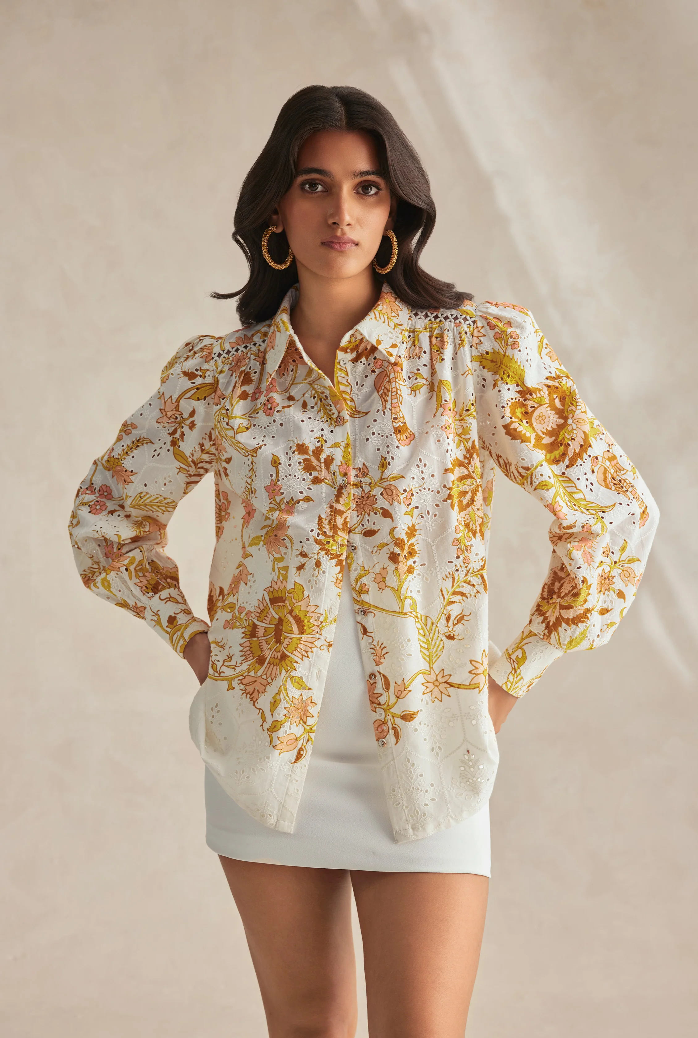 The Tora Off White Printed Top is a forever versatile silhouette from the Spring'24 collection. Crafted with comfortable cotton schiffli, the top boasts a pleasing floral chintz pattern, smart shirt collar, and blouson sleeves with a cuff. The relaxed silhouette flows into a curved hemline and has a front button closure. The Tora Top comes with the inner camisole for added comfort and is best teamed with the Tora Pants for an effortless weekend brunch look